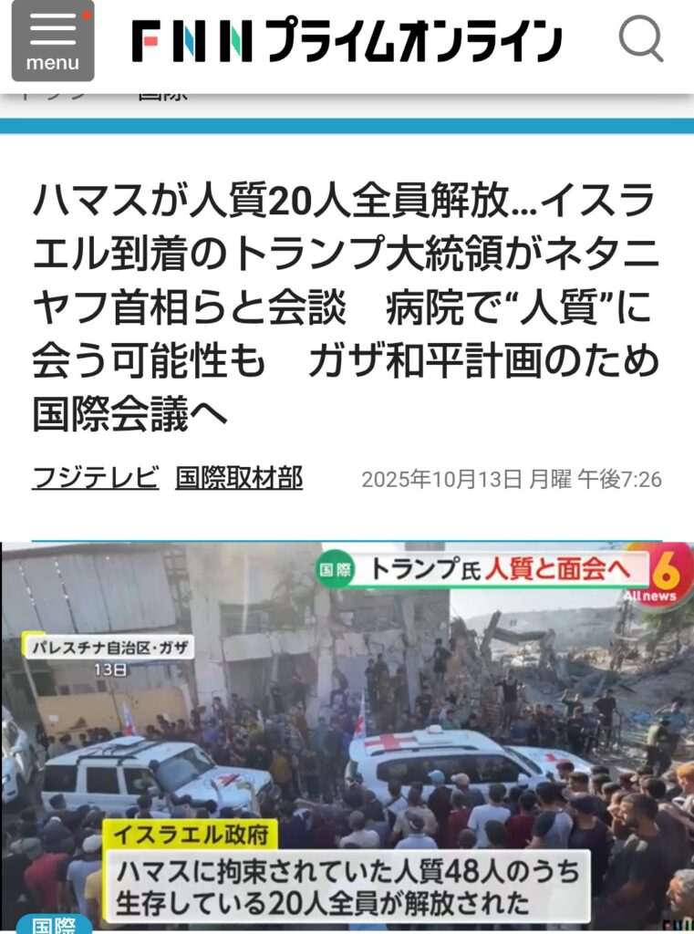 なんかさ、ハマスが人質の一部を開放して、ガザが停戦で、