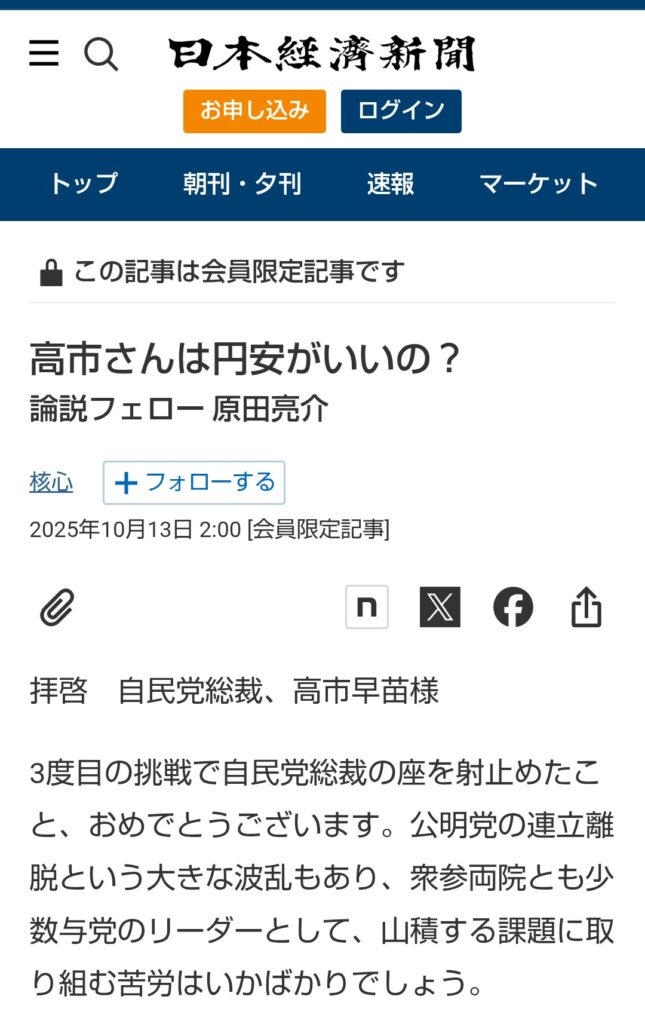 円安が進んでるような報道してるのも、新しい首相の高市さんが積極財政方針だからじゃなく、単に日本がアメリカに対して、日本円がアメリカドルに対して弱い要素しかないからだし。