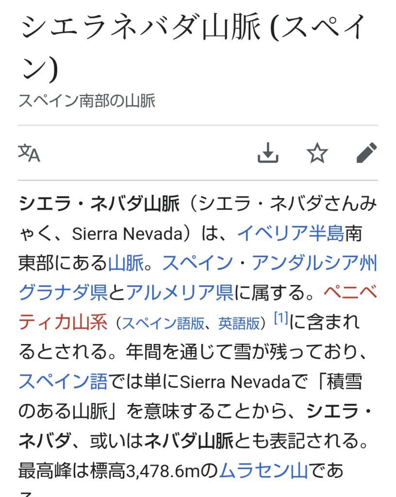スペインの南端、すぐ南にはアフリカ大陸のモロッコだってのに、雪が積もっちゃうヤバい山脈じゃんね。