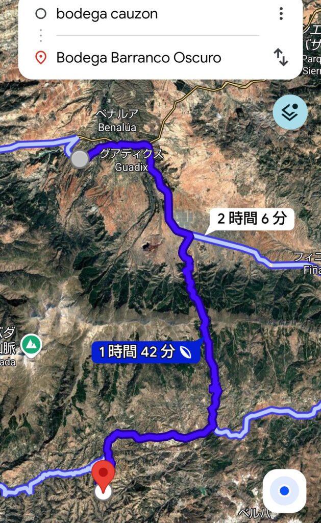 僕はヘレス・デ・ラ・フロンテーラから4時間走ってBODEGA CAUZON行って、それは高速使うから運転は楽チンで、そっから山越えてBARRANCO OSCURO行って、更に南下してMalagaに戻るルートだったんだけど。