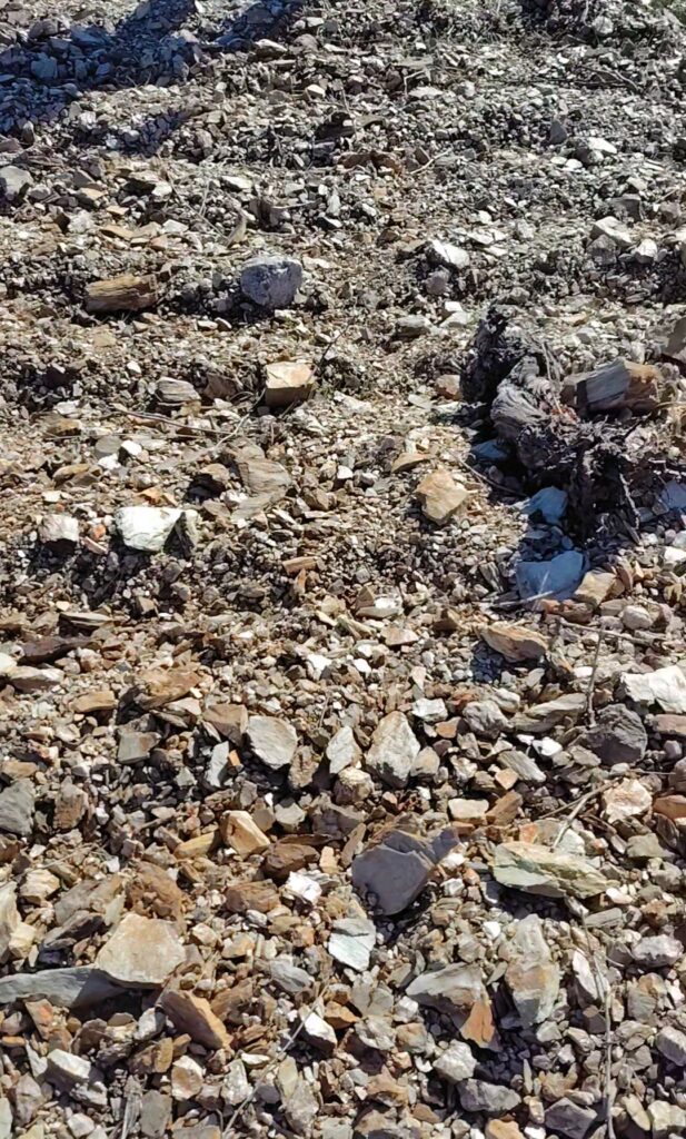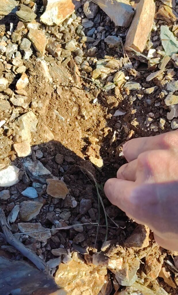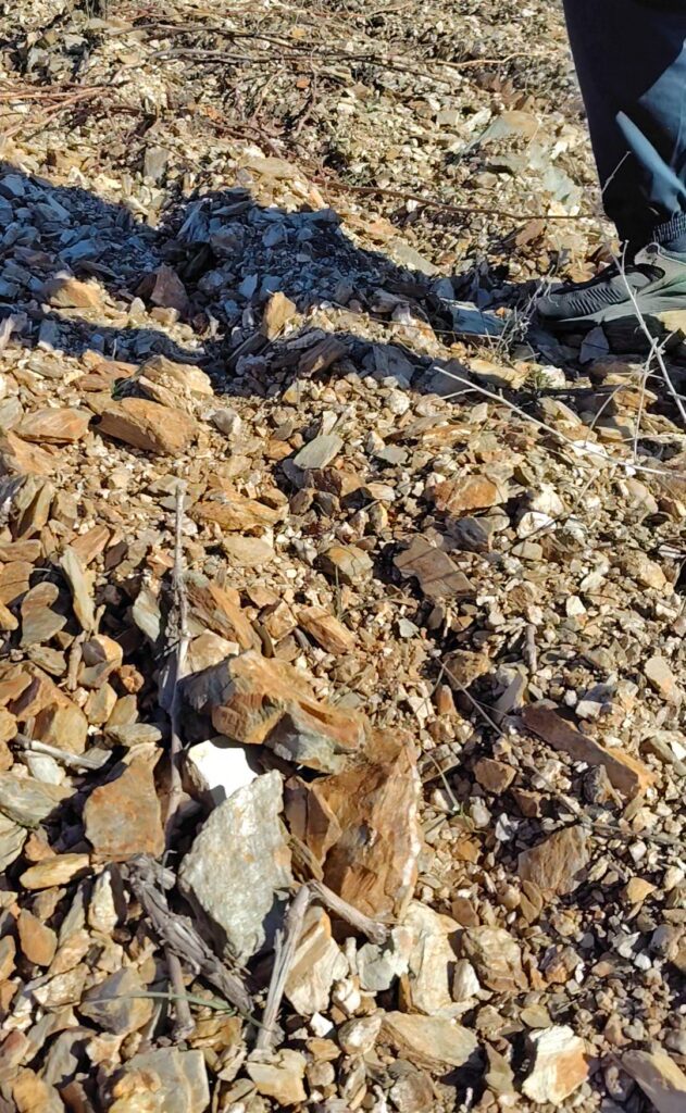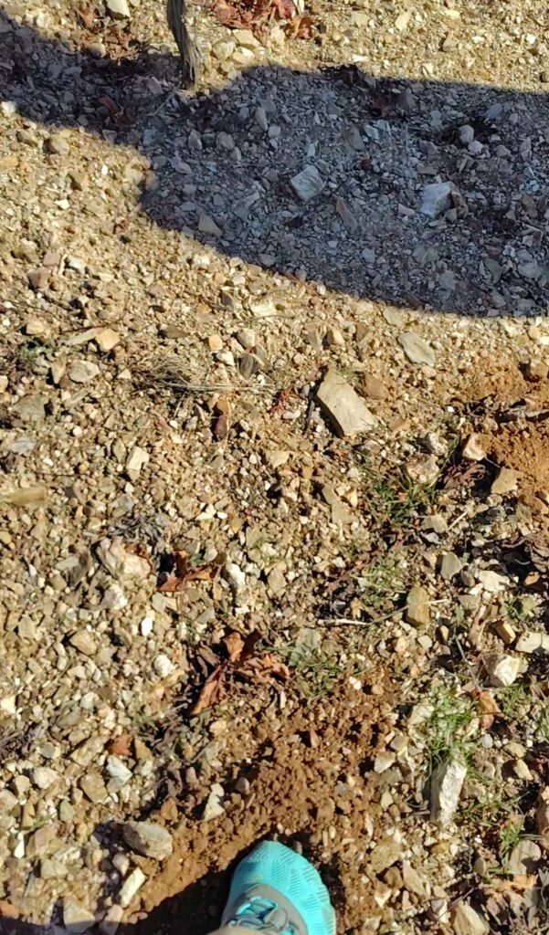 でっかい石だらけの表面の下はカチカチの粘板岩土壌。めっちゃ硬いー!