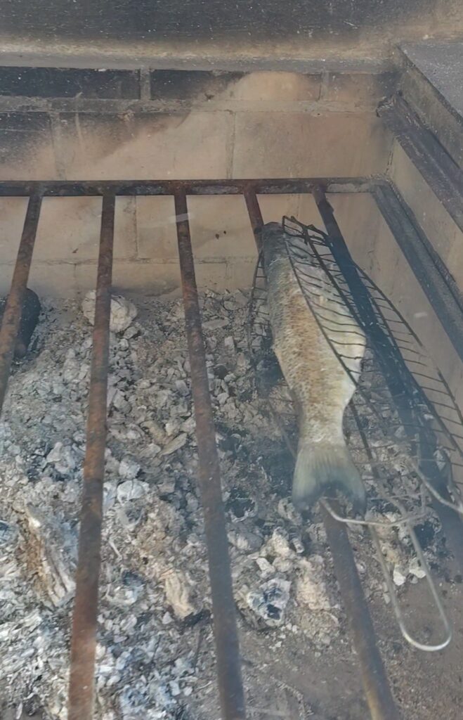 お手製のマグロ燻製マリネもめっちゃ旨いし、炭焼き台ではデカい魚が遠火で焼かれてるし。
