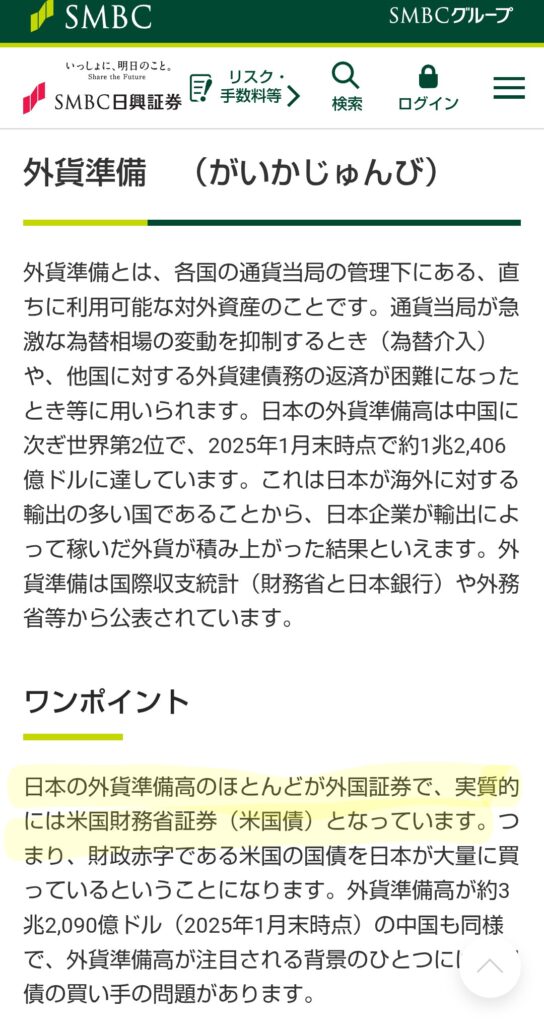 それに、財務省ホームページで公表されてる外貨準備金、1.3兆ドル(約200兆円)と巨額だけど、そのうちアメリカ国債とか証券が約3/4。