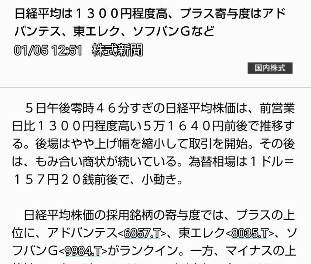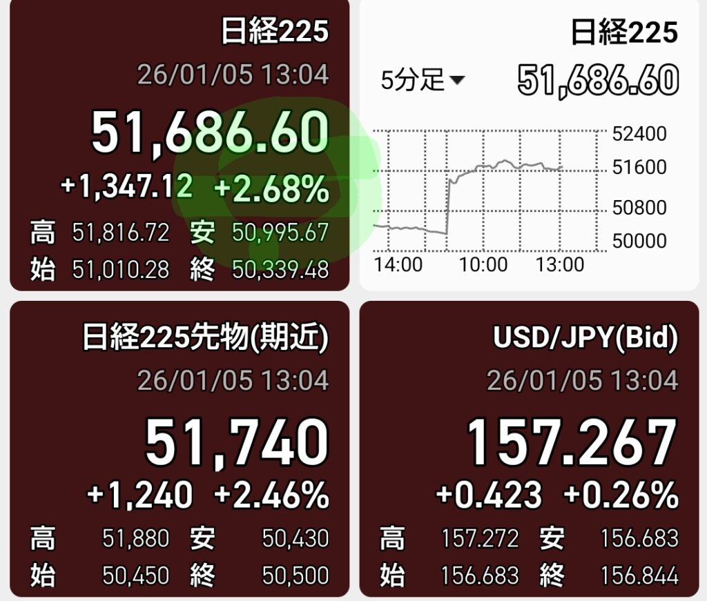 今日1/5(月)、日本の株式市場が動き出したんだけど、なんか日経平均が景気よく前営業日比で+2.5%以上って。