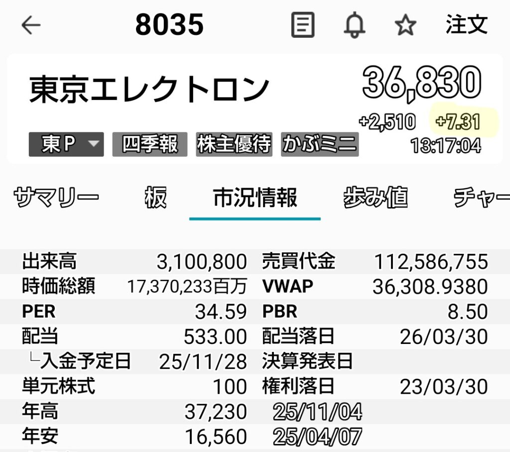 AI関連ってんで、半導体製造装置の東京エレクトロンが前営業日比で+7.31%。