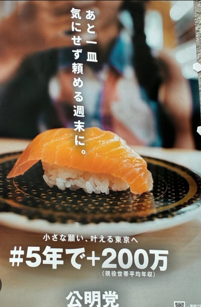 おカネないのに鮨なんて、おかしいって思う僕が異常なのか、日蓮大聖人の仏法を信仰する在家仏教団体 創価学会の政党 公明党が、所得に関係なく選挙権持ってる低所得低資産日本国民のハートに響くことだけを考えたポスターが正論なのか。