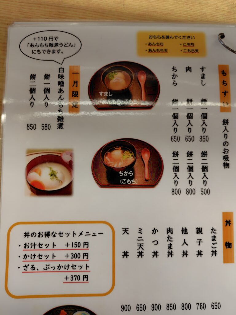 何やら「1月限定」っていう、僕のニガテな限定メニューがあるから、気がついたら「白味噌餡餅雑煮+ウドン」を注文してた。限定は卑怯なり。