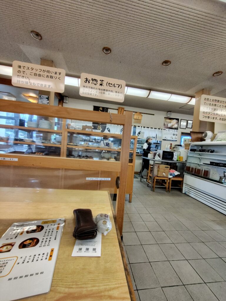お惣菜充実した食堂って感じで、お餅も持ち帰りで売ってたから、とりあえずお土産に餡餅買って。