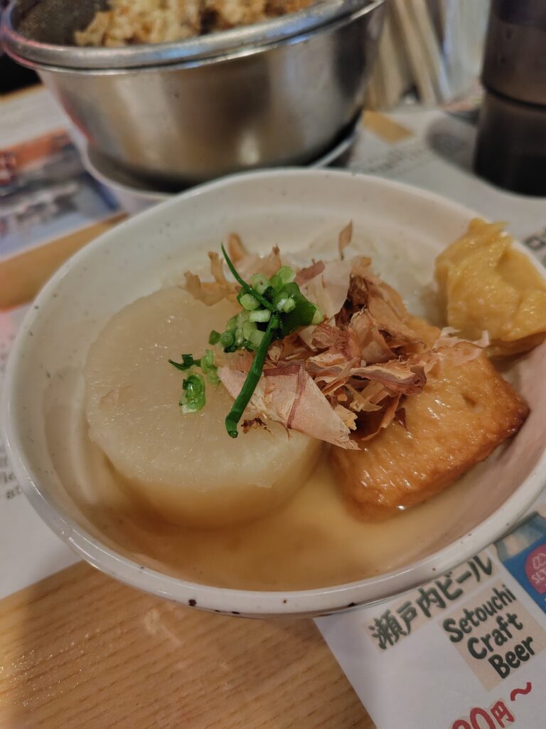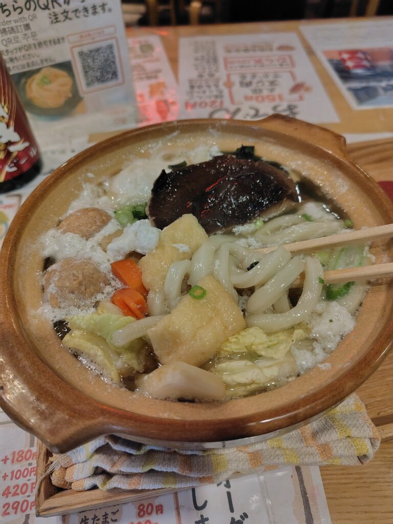 ビール+おでんと、寒いし興味あって鍋焼きうどん頼んだんだけど。