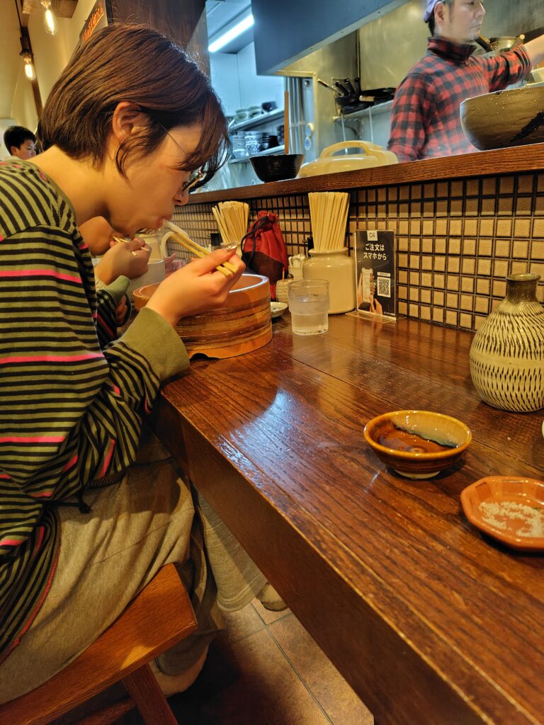 ずーっと、一切つけ汁使わず、ひたすらダイレクトにタライの茹で汁からうどんをすする女子。