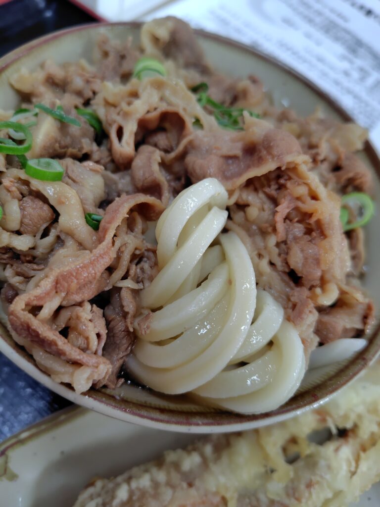 ビビったけど、巨大なオタマいっぱいのお肉がドーンと乗ったおうどん。
