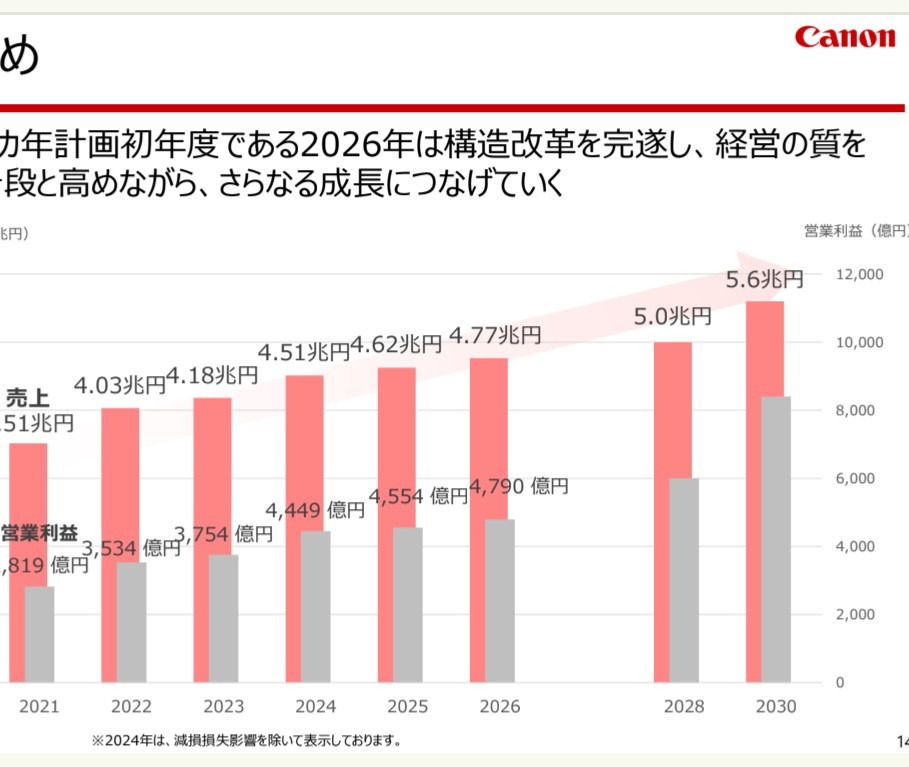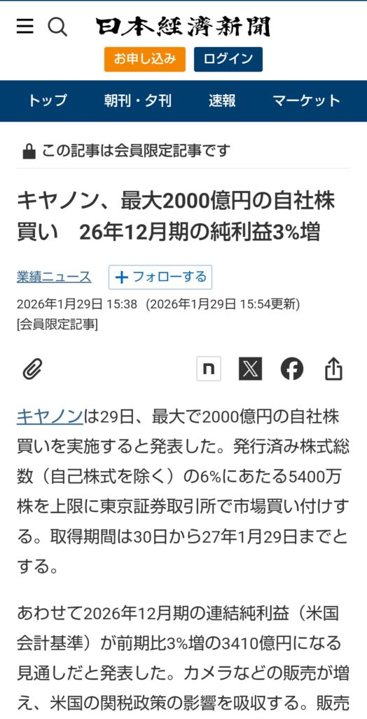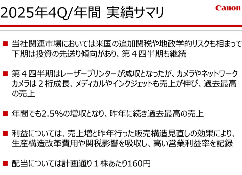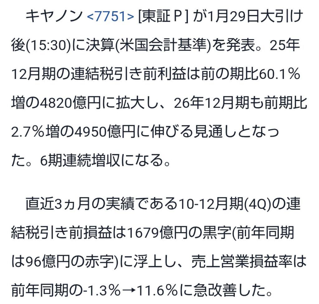 極めてロジカルな経営してるキヤノン、数年前に経理部門や生産管理部門の「AIリストラ」やるだろなー、そしたら益々増益➡増配しちゃうだろなー。
