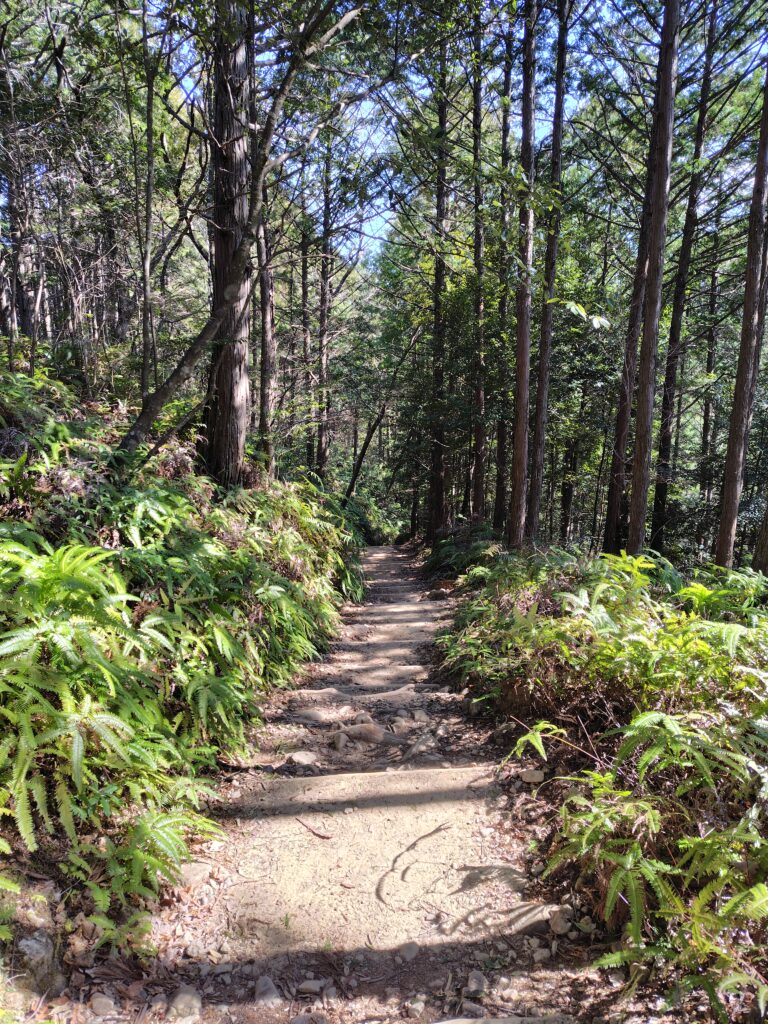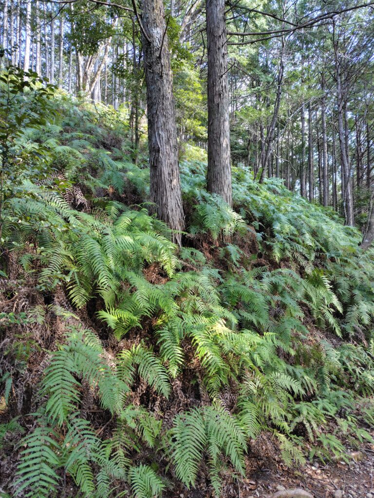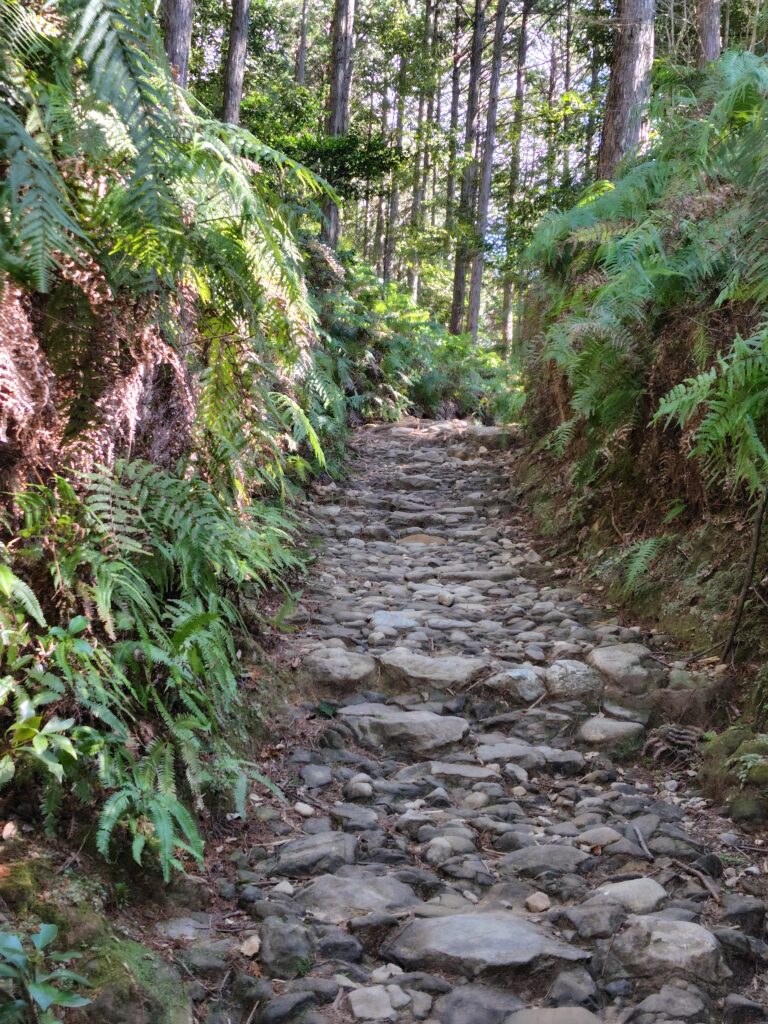 シダ生い茂る緑美しい古道が続くけど、正直それどころじゃないし。