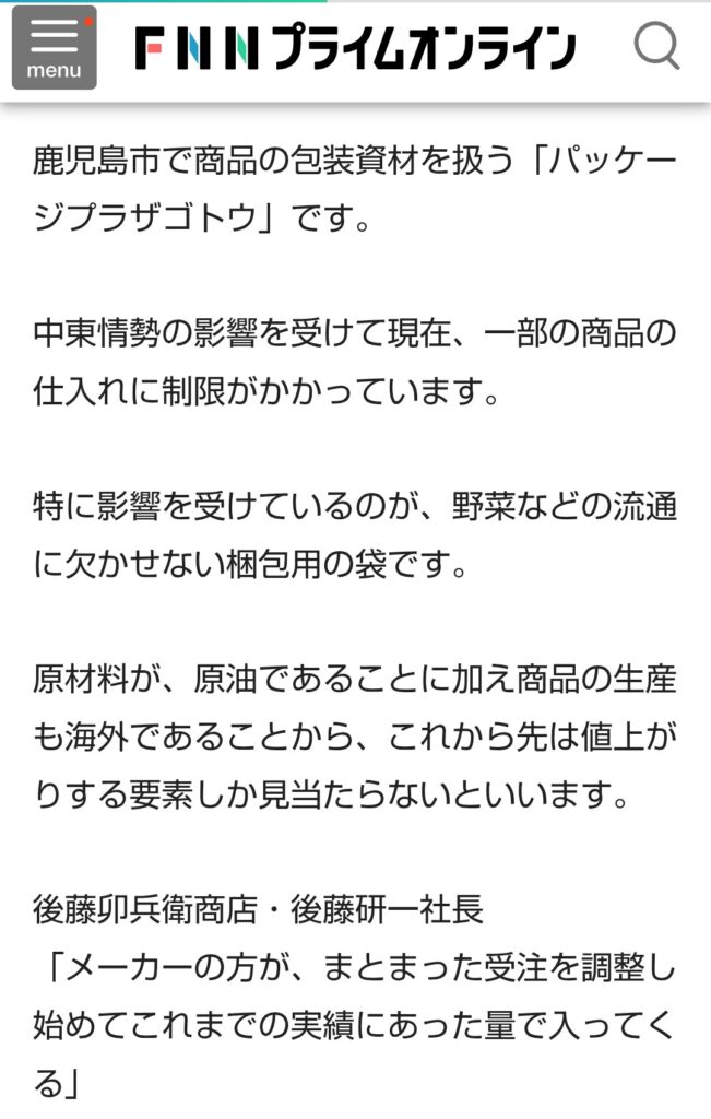 その点、日本のニュース番組やらはアホ向け報道ばっかで、スーパーのビニール包装や発泡スチロール梱包資材が値上がりしてるから生鮮食品とか値上げになるとかって、かなり日本らしい穏やかな感じのフィルター報道になってんだけど。