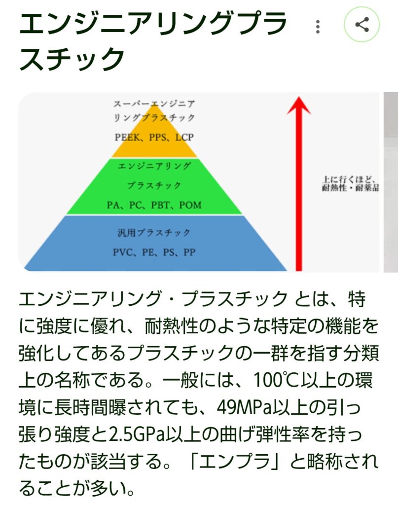 特に、自動車部品の中でも耐久性や耐候性、精密度合が尋常じゃない、いわゆるエンプラ、エンジニアリングプラスチックなる超ハイグレードなプラスチックだったり、